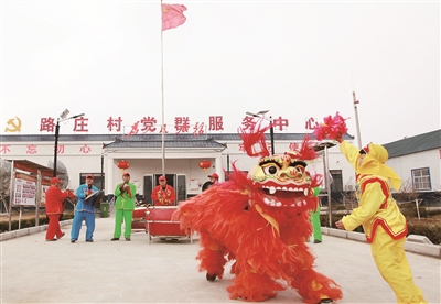 伴隨著鑼鼓鏗鏘聲,領獅人不時做出空翻、側翻等高難度動作,手中的繡球上下翻飛,惟妙惟肖的獅子撲、跌、翻滾、跳躍。在大周鎮路莊村新建成的村部內,精彩的少兒舞獅表演引得現場掌聲陣陣。