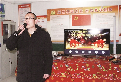 “去年俺唱了一首《駝鈴》后,就成了俺村的‘民星’。這不,兩個月前,紅亮叔就給俺打招呼,讓俺今年還得唱。”賈二猛笑著說。他口中的“紅亮叔”是賈集村村委委員、文化協管員賈紅亮。“俺賈集文化底蘊深厚,村民有喜歡吹嗩吶的,有愛好唱戲曲的,有熱衷跳廣場舞的,有擅長寫書法的。村‘兩委’琢磨著咋把這些文化資源整合起來,于是就想到了辦‘村晚’,并向村民發出了‘賈集大舞臺,有才你就來’的節目招募通知。”賈紅亮告訴記者。