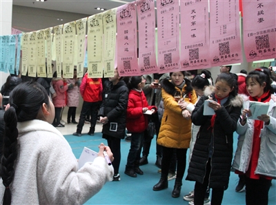 元宵節期間,300余名市民和讀者參與了許昌市圖書館舉辦的第六屆“鬧元宵、猜燈謎”有獎競猜活動。400條燈謎整齊有序地懸掛在紅繩上,五彩繽紛,營造出節日的喜慶氣氛。謎面內容包含漢字、人名、地名、花卉等,還專設了兒童燈謎,涉及面廣,趣味性強,吸引了市民的踴躍競猜。