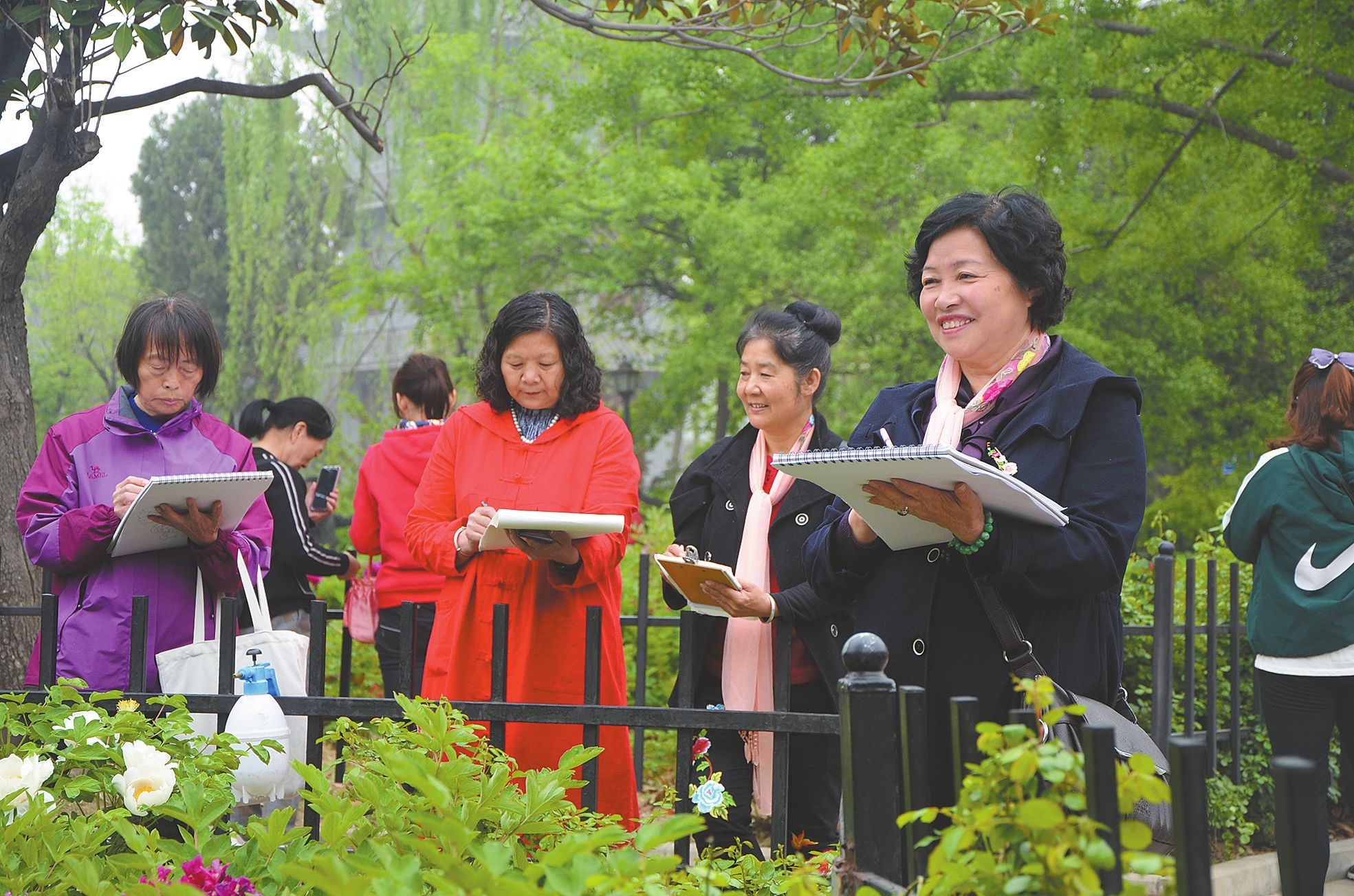 4月8日,許昌市老干部大學的學員們正在市區西湖公園牡丹園內寫生。近日,市區西湖公園的牡丹花盛開,吸引市民紛紛前來寫生拍照。 本報記者 史晶 攝