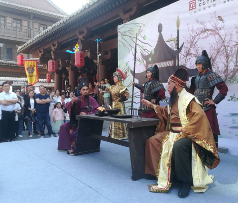 曹魏古城演出的情景劇《青梅煮酒論英雄》吸引觀眾的眼球。 記者 張莉莉 攝
