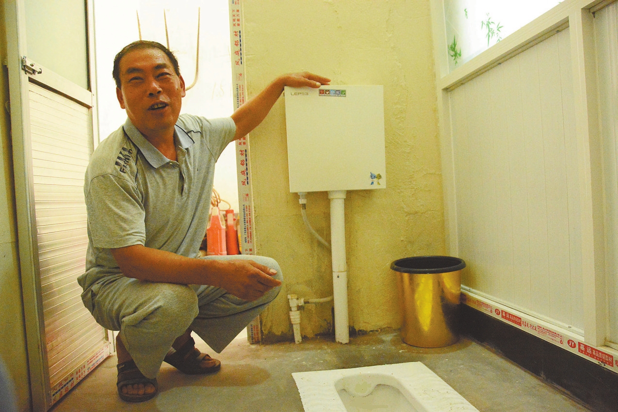 手指輕輕一按,“嘩啦”一聲,污物通過便池順流而下。 “往年一到夏天,蚊蠅成群結隊,現在你看,可干凈,俺全家很滿意!”8月14日下午,在襄城縣潁陽鎮管武村,55歲的村民韓學成說起自己家新安裝的按壓式抽水馬桶時,笑得合不攏嘴。