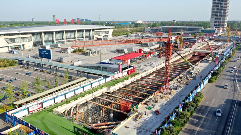 圖為5月8日拍攝的鄭許市域鐵路許昌東站加緊施工現場。鄭許市域鐵路(許昌段)項目北起鄭州、許昌市界,南端止于許昌東站,全長33.7公里,沿途設站11座,工程設計時速120公里,計劃2020年12月6日通車運營。