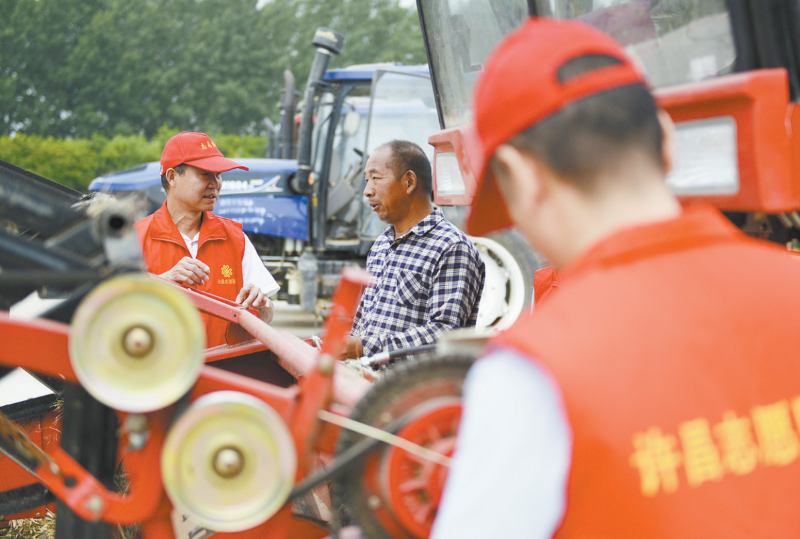 為保證“三夏”工作順利推進,連日來,許昌市農機推廣站統一部署,組織志愿者服務隊分赴各縣(市、區)開展農機維修服務活動。圖為5月26日志愿者在建安區五女店鎮興旺農機合作社進行技術指導。