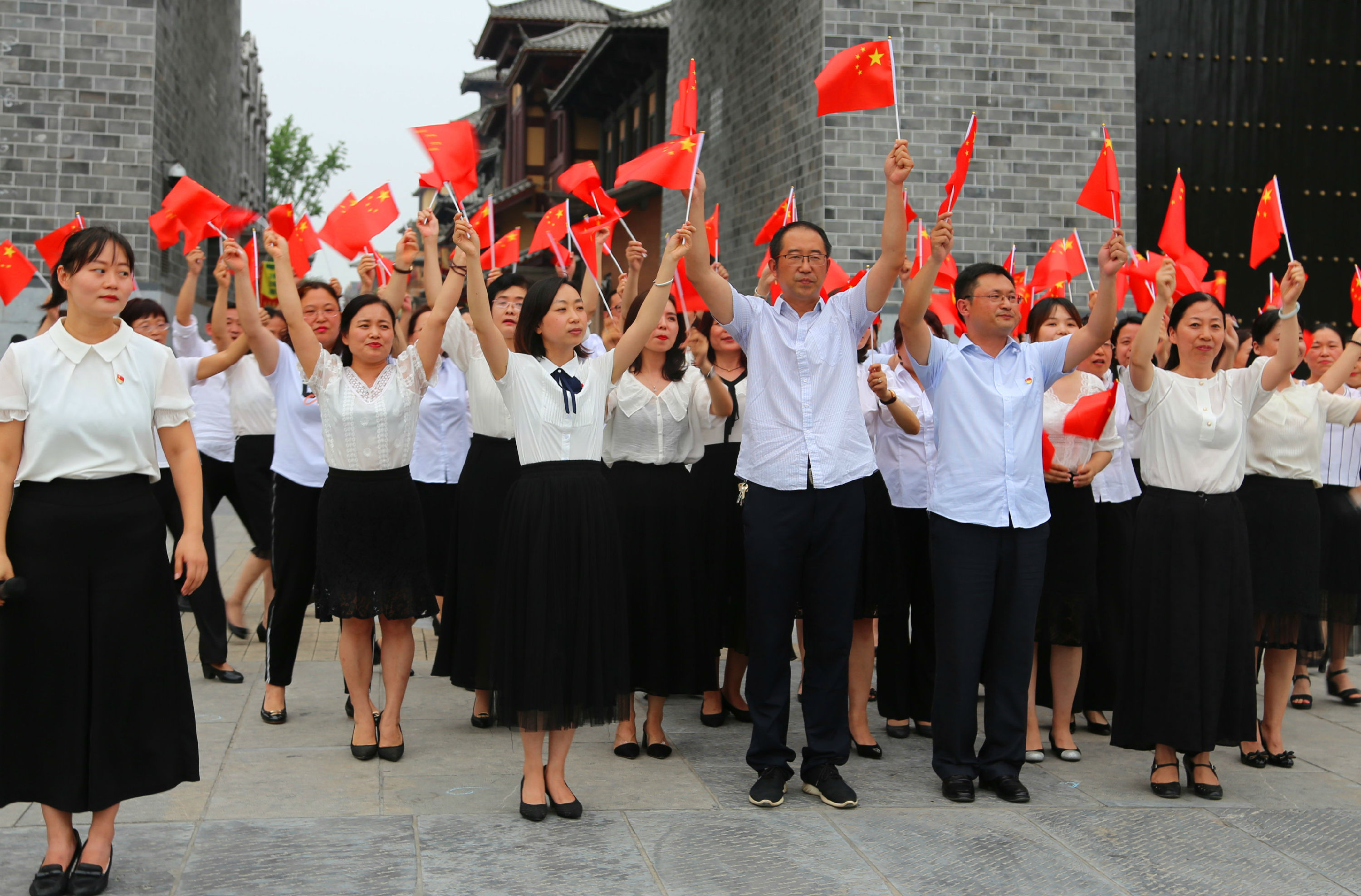 近日,在曹魏古城南城門,許昌市教師進修學校的老師排成整齊的隊伍,手持國旗,齊聲高唱《我和我的祖國》,引得不少路人駐足拍照。