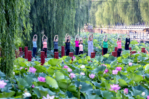 夏日,護城河中的荷花競相開放,美得宛如一幅畫。瑜伽愛好者們在千百朵盛開的荷花叢中練習瑜伽,上演一場瑜伽與荷花的美麗約會。 晨報攝友 楊望祥 攝