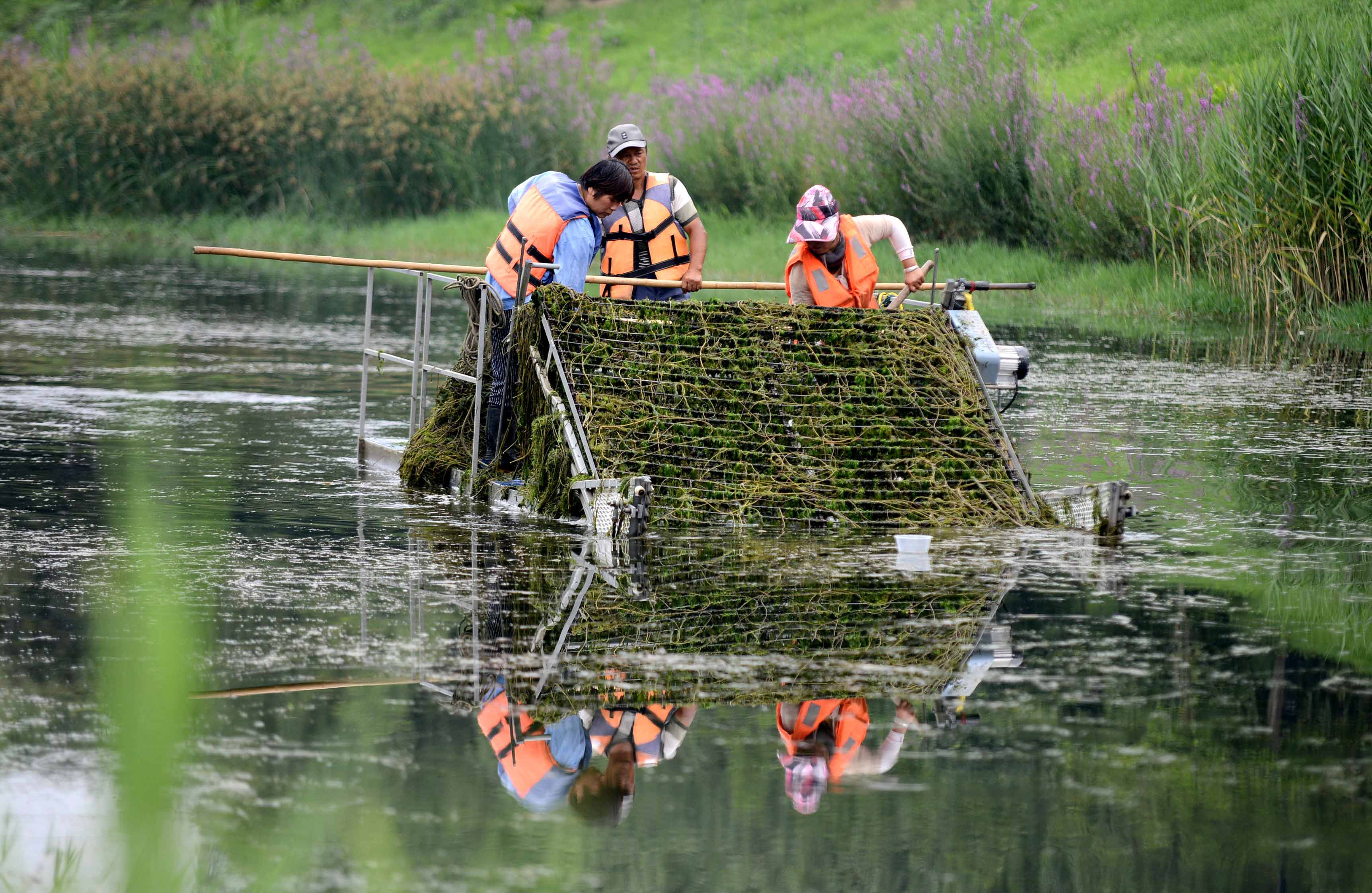 7月4日,市區(qū)灞陵河內(nèi),工人們正駕駛自動水草收割船清理水草。進入夏季,魏都區(qū)部分河道內(nèi)水草瘋長,當?shù)厮畡?wù)部門及時派出人員,采用自動水草收割船收割水草,“護航”水環(huán)境。