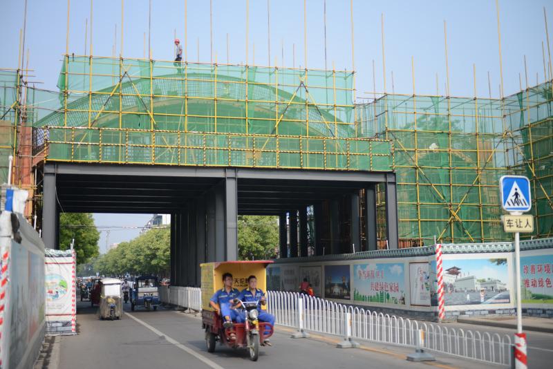 7月11日,人們從建設(shè)“正酣”的曹魏古城東城門下經(jīng)過。曹魏古城東城門位于東大街東段(西順河街以西、東城墻街以東),橫跨東大街,為多層復(fù)建仿古游覽建筑,主城門兩側(cè)各有一拱形側(cè)門,建成后將形成獨(dú)特的一景。