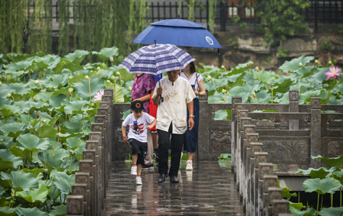 7月17日,蓮城下起陣雨,空氣變得格外清新,市民撐傘漫步在西湖公園內。晨報攝友 楊望祥 攝 ?