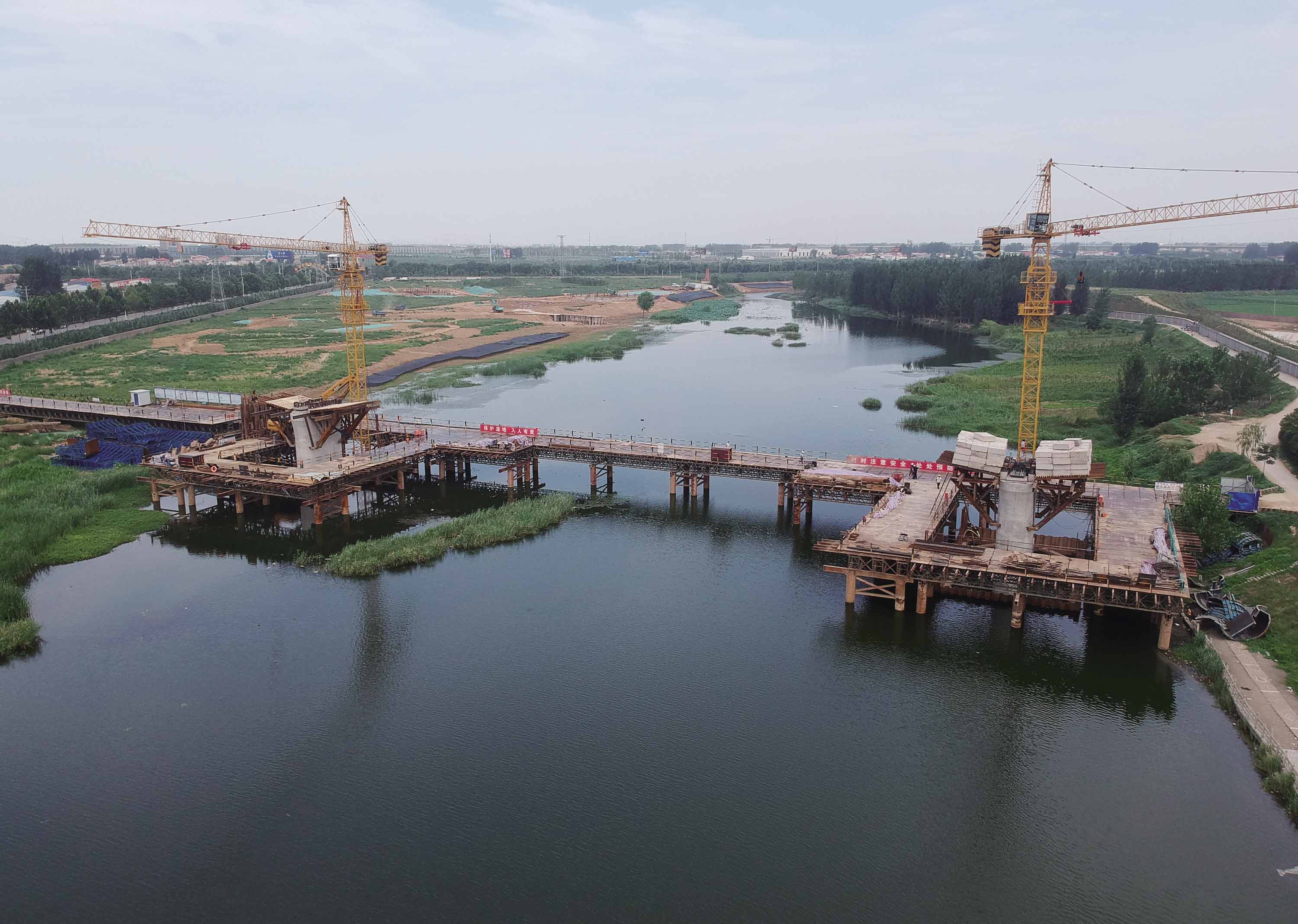 7月23日,在鄭許市域鐵路工程許昌段連續梁項目建設現場,工人們正在施工。該項目位于長葛雙洎河濕地公園,以連續梁形式,交角78°跨越雙洎河,共分為24個對稱澆筑段和3個合龍段,預計11月底項目完工,現在正在進行托架預壓階段施工。