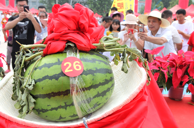 7月24日,鄢陵縣陶城鎮(zhèn)舉辦了一場“瓜王大賽”。該鎮(zhèn)南孫莊村瓜農(nóng)孫留洋培育的一個重35.5公斤的西瓜,奪得“瓜王”稱號。此次大賽收到參賽西瓜800多個,重量超過30公斤的有100多個。活動現(xiàn)場,簽約售瓜、西瓜擂臺賽、吃西瓜大賽等豐富多彩的活動讓當(dāng)?shù)毓限r(nóng)體驗豐收的快樂。圖為村民拍攝“瓜王”留念。 記者 牛書培 攝 ?