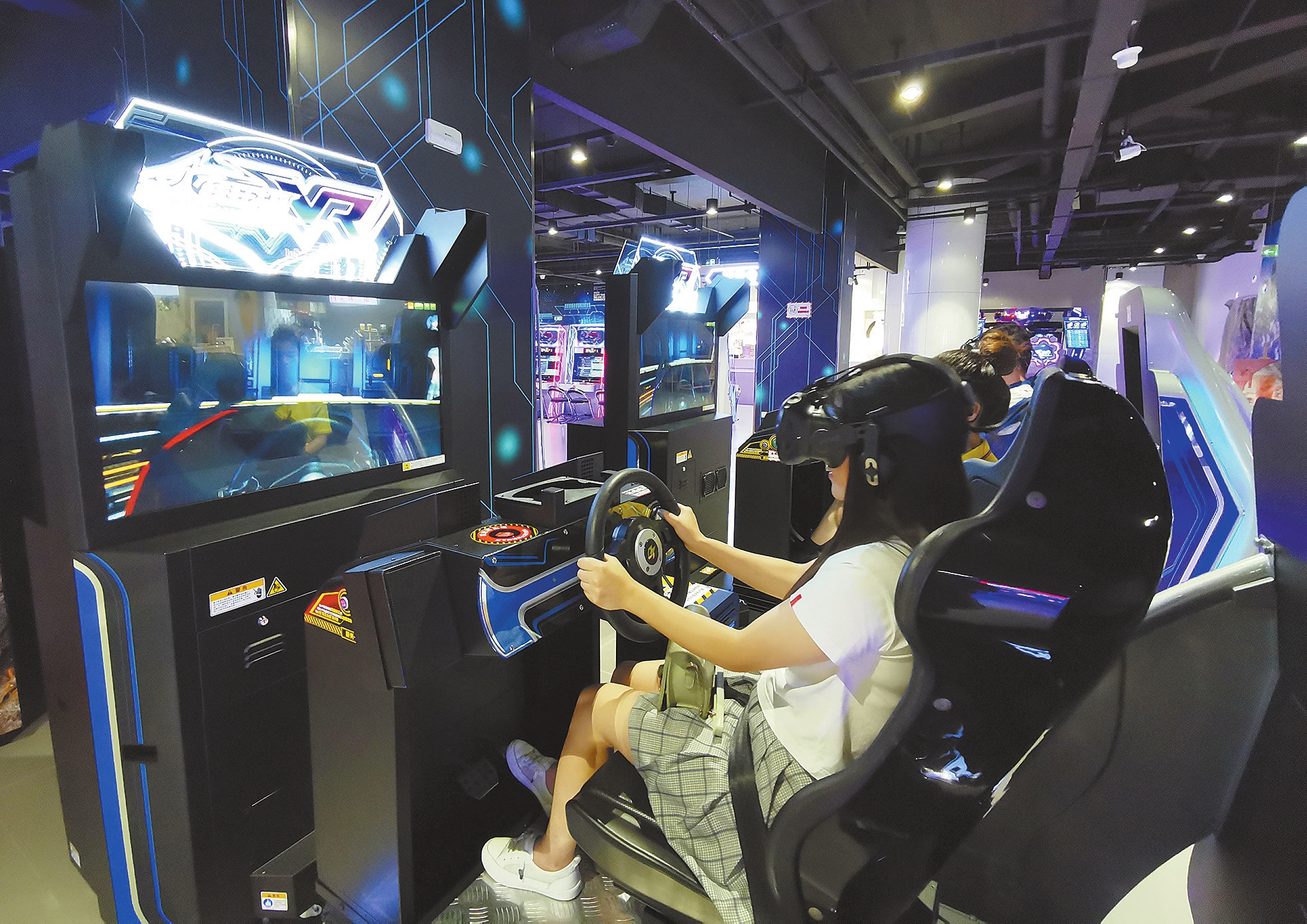 8月5日,市區一商場內VR游戲體驗區,市民正在體驗賽車游戲的驚險與刺激。據了解,VR游戲是一種新興技術產物的虛擬現實設備,體驗者通過佩戴虛擬現實頭盔,就可以利用電腦模擬產生一個三維空間的虛擬世界,給體驗者帶來視覺、聽覺、觸覺等感官體驗。本報記者 喬利峰 攝