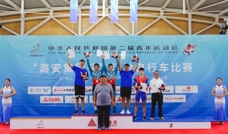8月9日,第二屆全國青年運動會場地自行車體校乙組男子一公里計時賽在山西省太原市舉行,我市選手薛鵬飛、韓鵬杰分別以1:03.705和1:03.709的成績包攬冠亞軍,為我市摘取 “二青會”第三金。圖為市體育局黨組成員、市體育運動學校校長袁海東為冠亞季軍頒獎并合影。