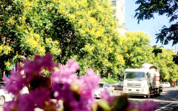 8月29日,一輛霧炮車正在東城區(qū)黃山欒盛開的興業(yè)路上灑水。如今,市區(qū)興業(yè)路、學府街等路段栽植的黃山欒正值花期,清香四溢,風吹過落英繽紛,格外好看。近年來,我市園林綠化部門通過改變綠植品種,努力實現(xiàn)城市景觀由綠化向彩化轉(zhuǎn)變,提升了城市品位。記者 牛志勇 攝 ?
