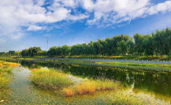 河道上,茂盛的水草,掩映于清澈的水中,與藍(lán)天白云構(gòu)成一幅美麗的畫卷。