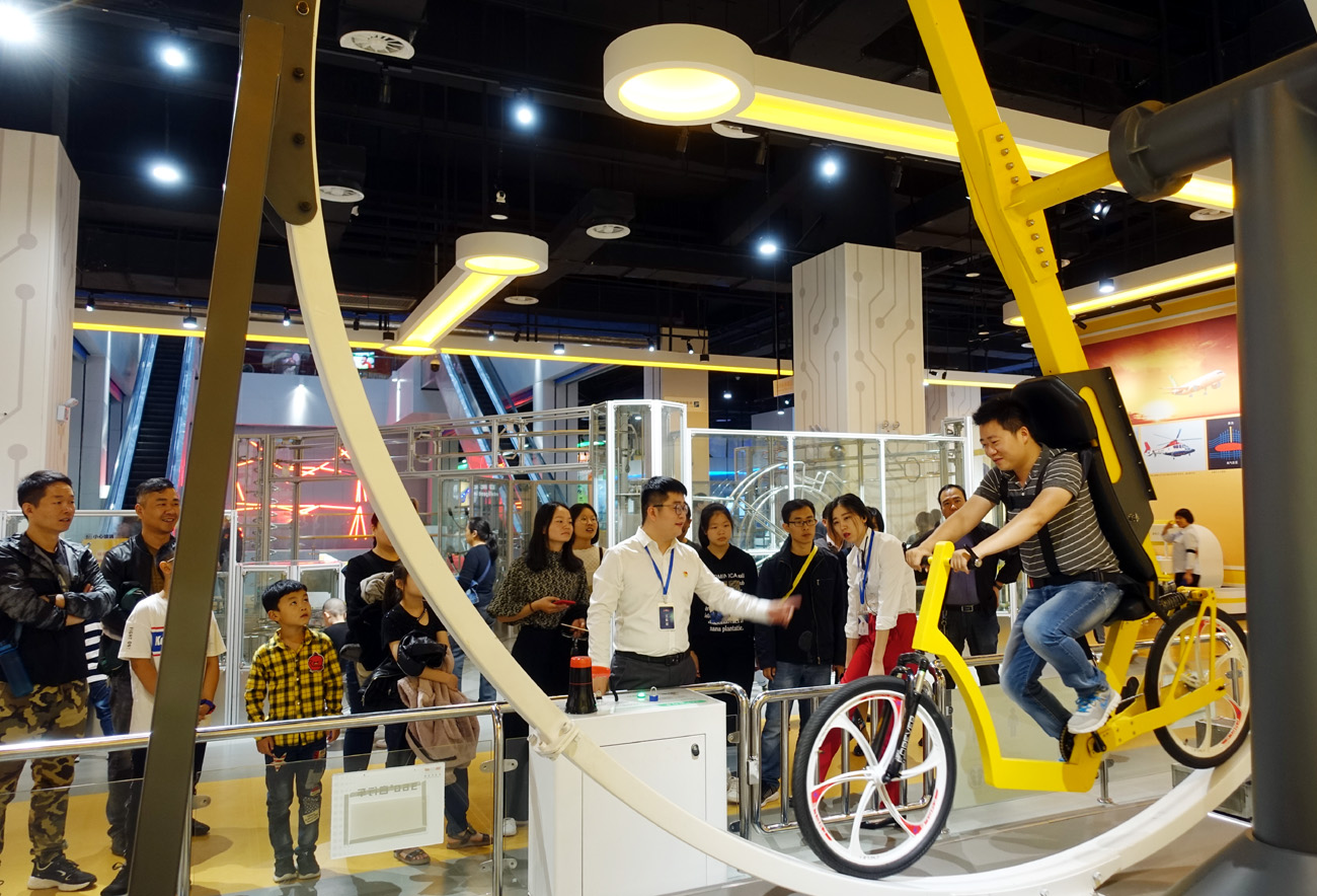 10月5日,市民在市科技館探索與創造主展區體驗360度自行車。當日,記者從市科技館了解到,國慶假期,不少市民帶領孩子來到市科技館參觀學習,享受豐盛的“科技大餐”。