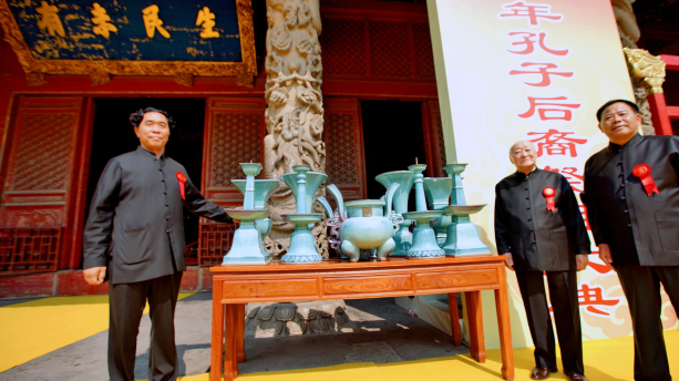 9月28日,在孔子故里山東曲阜,海內(nèi)外500多名孔子后裔代表齊聚孔廟,舉行家祭活動,紀(jì)念孔子2570周年誕辰。活動現(xiàn)場,由中國工藝美術(shù)大師孔相卿(左一)制作的“鈞瓷珍品五供”替換清雍正御賜的“銅胎畫琺瑯五供”,放入大成殿。據(jù)悉,作為孔子第74代后裔,孔相卿緬懷祖上恩德,多年構(gòu)思制作“鈞瓷五供重器”。 記者 牛書培 攝