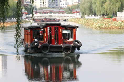 10月16日,游客乘坐游船在護(hù)城河上賞秋。金秋時(shí)節(jié),護(hù)城河內(nèi)蓮蓬與荷葉的顏色逐漸變深、變黃,呈現(xiàn)秋天的韻味。風(fēng)起處碧波蕩漾,荷葉起伏,柳枝搖曳,游船駛過蕩起層層漣漪,美得別有一番韻味,吸引眾多市民及游客前來觀賞。 記者 牛書培 攝