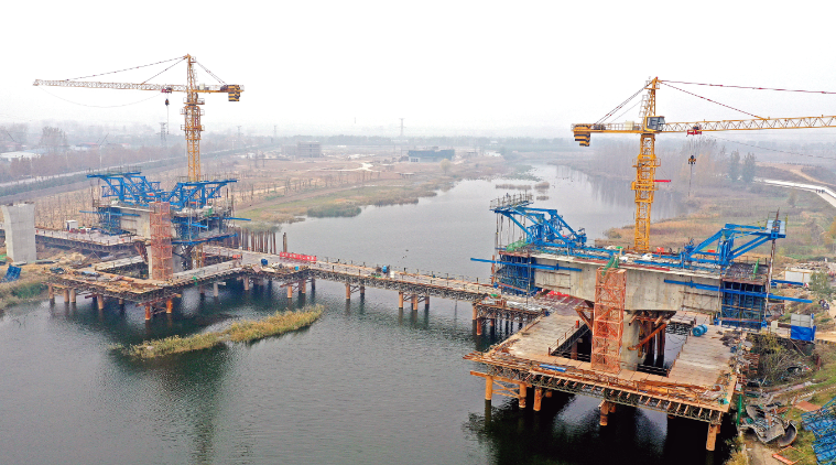 11月24日拍攝的鄭許市域鐵路跨雙洎河橋施工現場。該項目位于長葛雙洎河濕地公園,以連續梁形式,交角78°跨越雙洎河,共分為24個對稱澆筑段和3個合龍段,目前正在進行托架預壓階段施工。據悉,鄭許市域鐵路跨雙洎河橋所在位置水面寬140米,水深約6米,需水中作業的兩個墩柱已完工。鄭許市域鐵路跨雙洎河橋因地質環境復雜、施工難度大、安全風險高,為鄭許市域鐵路工程施工難點之一。 記者 牛書培 攝