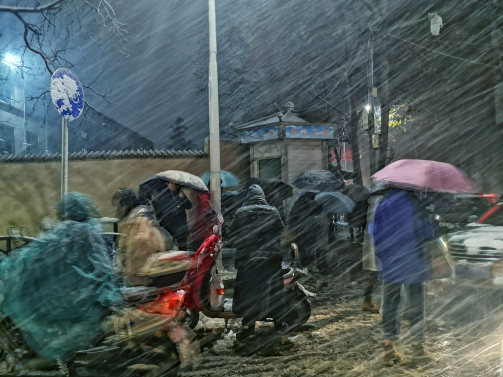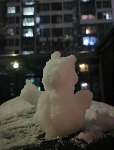 1月7日清晨,天空時而下起小雨,時而飄起雪花,時而下起雨夾雪,1月6日晚上那種大片的雪花沒有再現。可是,這又有什么關系?那用雪堆起來的可愛小熊、那些美麗的雪景照片定格了雪夜的美好記憶。