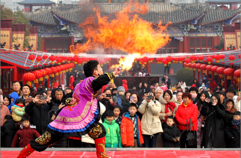 1月17日上午,演員在灞陵橋新春大廟會表演噴火。當日,第七屆灞陵橋新春廟會開幕。據悉,為滿足游客的旅游需求,春節期間,我市將立足自身優勢,充分發掘民俗文化、生態環境、節慶活動、特色美食等各類資源,集中推出一系列年味兒十足的民俗文化旅游活動。記者 牛書培 攝