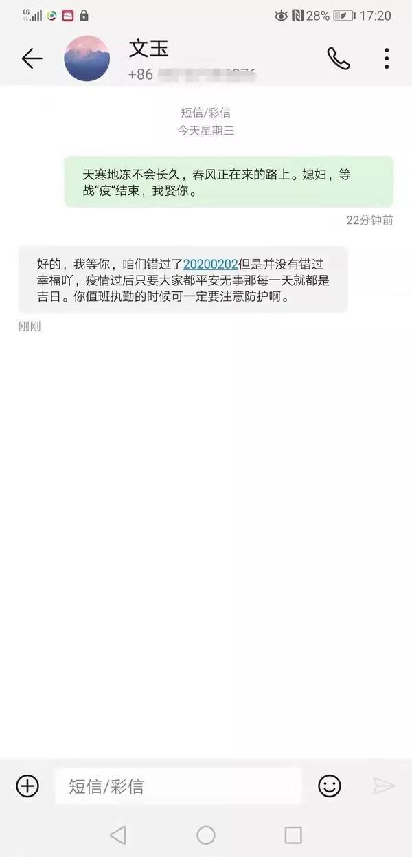 2月2日當天,是成都郫都區人民醫院醫生張仕華與未婚妻步入婚姻殿堂的日子,也是張仕華進入隔離病房的第12天。當天,他與未婚妻隔窗相望,寫下了一段感人的誓言:今天,我欠你一個婚約。今生,我用一生守護。