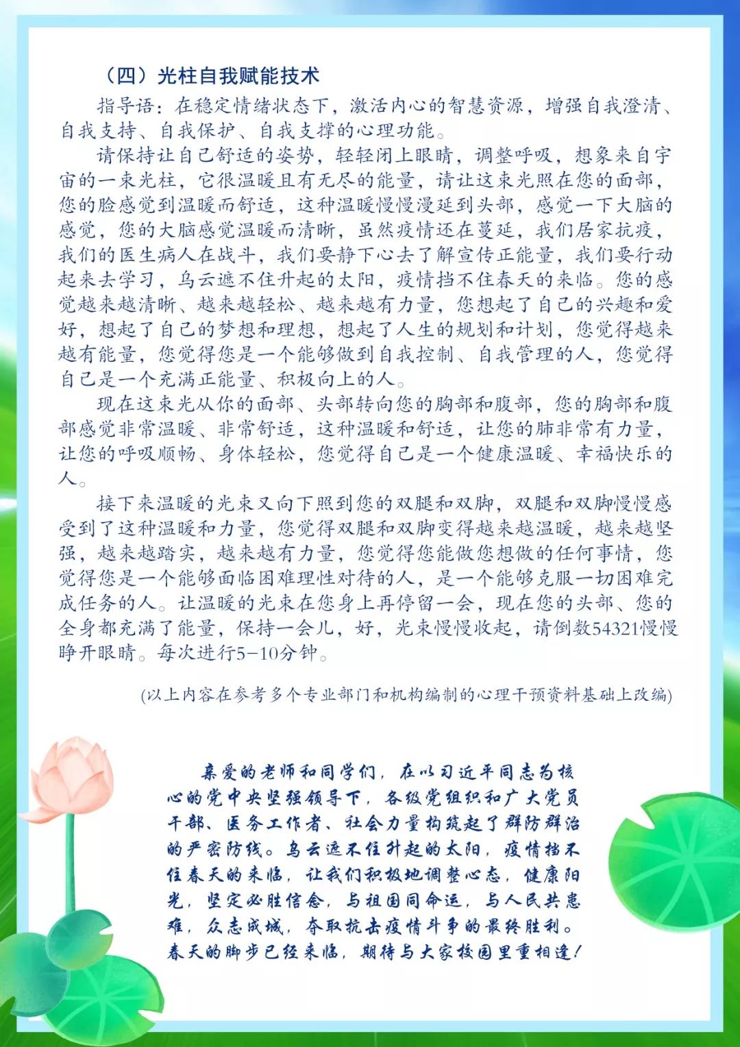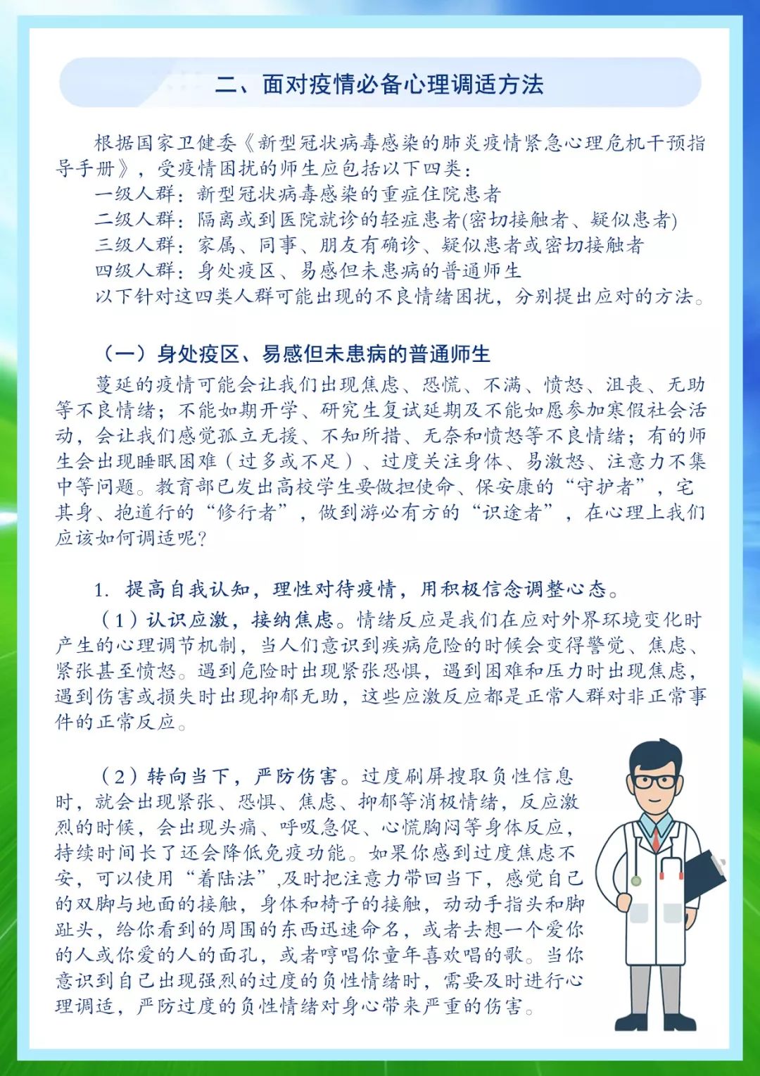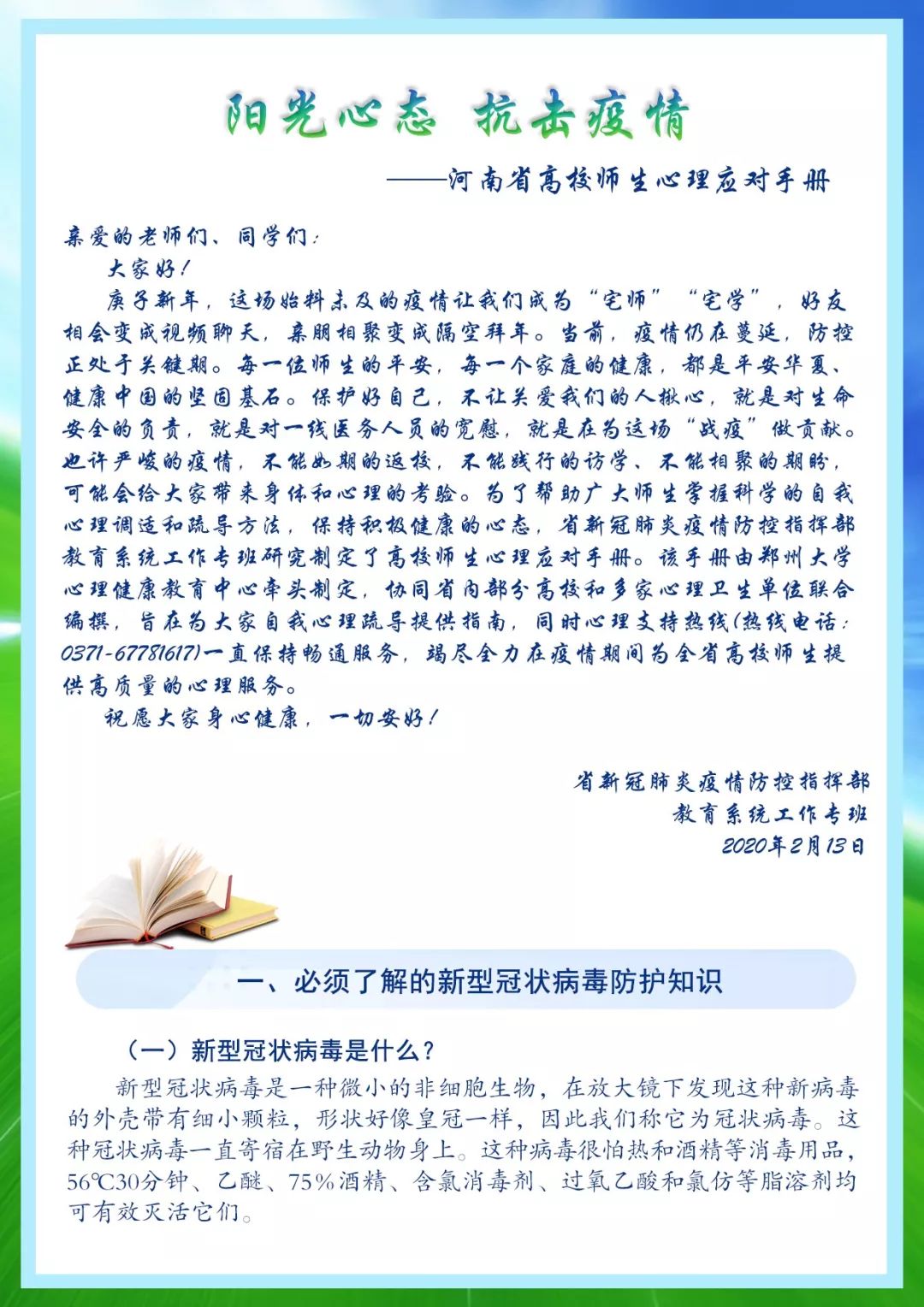 為了幫助廣大師生理性客觀面對疫情,掌握科學(xué)的自我心理調(diào)適和疏導(dǎo)方法,保持積極健康的心態(tài),省新冠肺炎疫情防控指揮部教育系統(tǒng)工作專班研究制定了河南省高校師生心理應(yīng)對手冊。