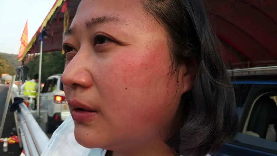 戴文豪是云梧高速省界聯(lián)合一線檢疫人員,一位有著18年黨齡的退伍軍人,同事口中的“萬能豪”。前線、后勤,哪里有活哪里就有他的身影,測量體溫、登記信息、統(tǒng)計數(shù)據(jù)、指揮車輛、搬飯菜……筆沒有墨了找他,測溫儀壞了找他,要上洗手間了或去用餐了都找他來替補。“有些年輕人到點吃飯了也不知道找人替換,不去催他們怕他們餓著。”他經(jīng)常是最后一個用餐的人,從早到晚一刻不停地轉(zhuǎn)著,就像一個“陀螺”。前段時間低至3℃的寒潮,加上近段時間暖春高至27℃的晴朗天氣,冷熱交替,使原本皸裂已結(jié)痂的臉又被曬得黃一塊、黑一塊、白一塊的,看著實在讓人心疼。江顏君:“既然回不了家,那就響應(yīng)號召,在崗位上多做點事兒。”江顏君,是一個既愛美又喜歡跳舞的姑娘。在云梧高速防疫一線連續(xù)工作了七八個小時,腰累、腿麻、喉嚨干、脖子僵硬,毒辣的太陽更是將她原來白皙粉嫩的臉蛋嚴(yán)重曬傷,導(dǎo)致紅腫過敏,甚至脫了層皮。臉上一出汗,頭發(fā)就容易粘到臉上,用手輕輕地撩開,劃過臉,都讓她覺得刺痛。