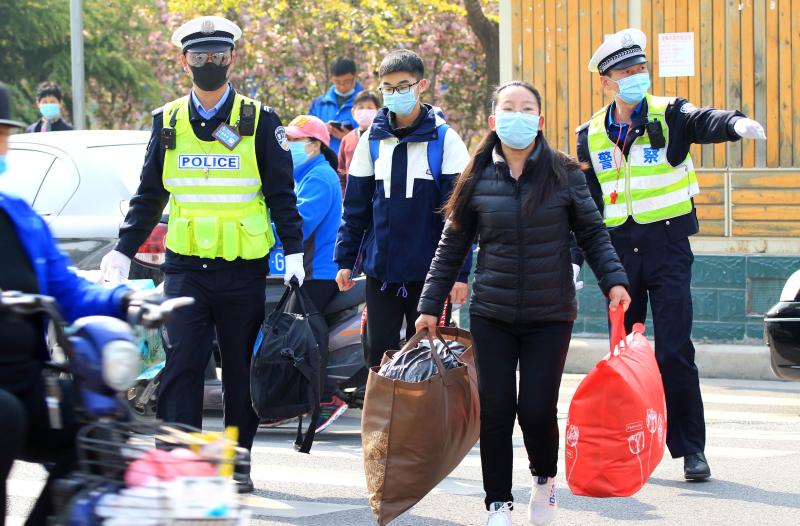 4月7日,民警在許昌高中附近疏導交通,幫助高三學生返校。