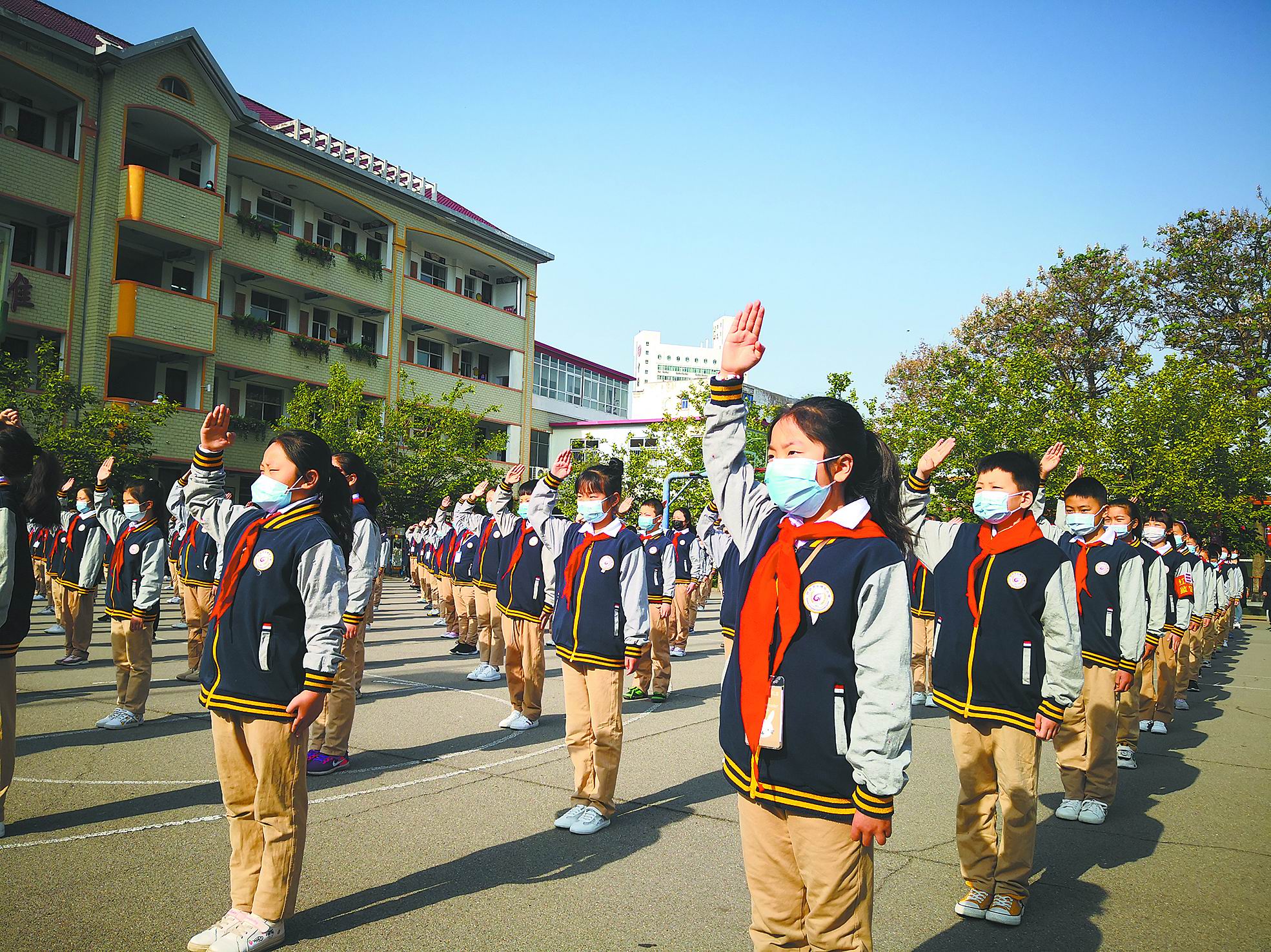 4月26日,經過漫長的“寒假”,我市初中一、二年級,中職類一、二年級及小學四、五、六年級學生終于返校復學。圖為市古槐街小學舉行升旗儀式暨春季開學典禮。
