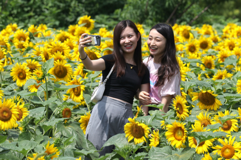 7月18日,游人在向日葵花海旁拍照。目前,襄城縣湛北鄉(xiāng)北姚村葵花正艷,黃花綠葉交相輝映,吸引眾多市民、游客前來(lái)觀賞。近年來(lái),襄城縣湛北鄉(xiāng)大力發(fā)展鄉(xiāng)村旅游,吸引游客前來(lái)體驗(yàn)生態(tài)風(fēng)光,品味特色美食,以旅游發(fā)展帶動(dòng)農(nóng)民經(jīng)濟(jì)的增收,推動(dòng)襄城縣鄉(xiāng)村旅游業(yè)健康、快速發(fā)展。記者 牛書培 攝