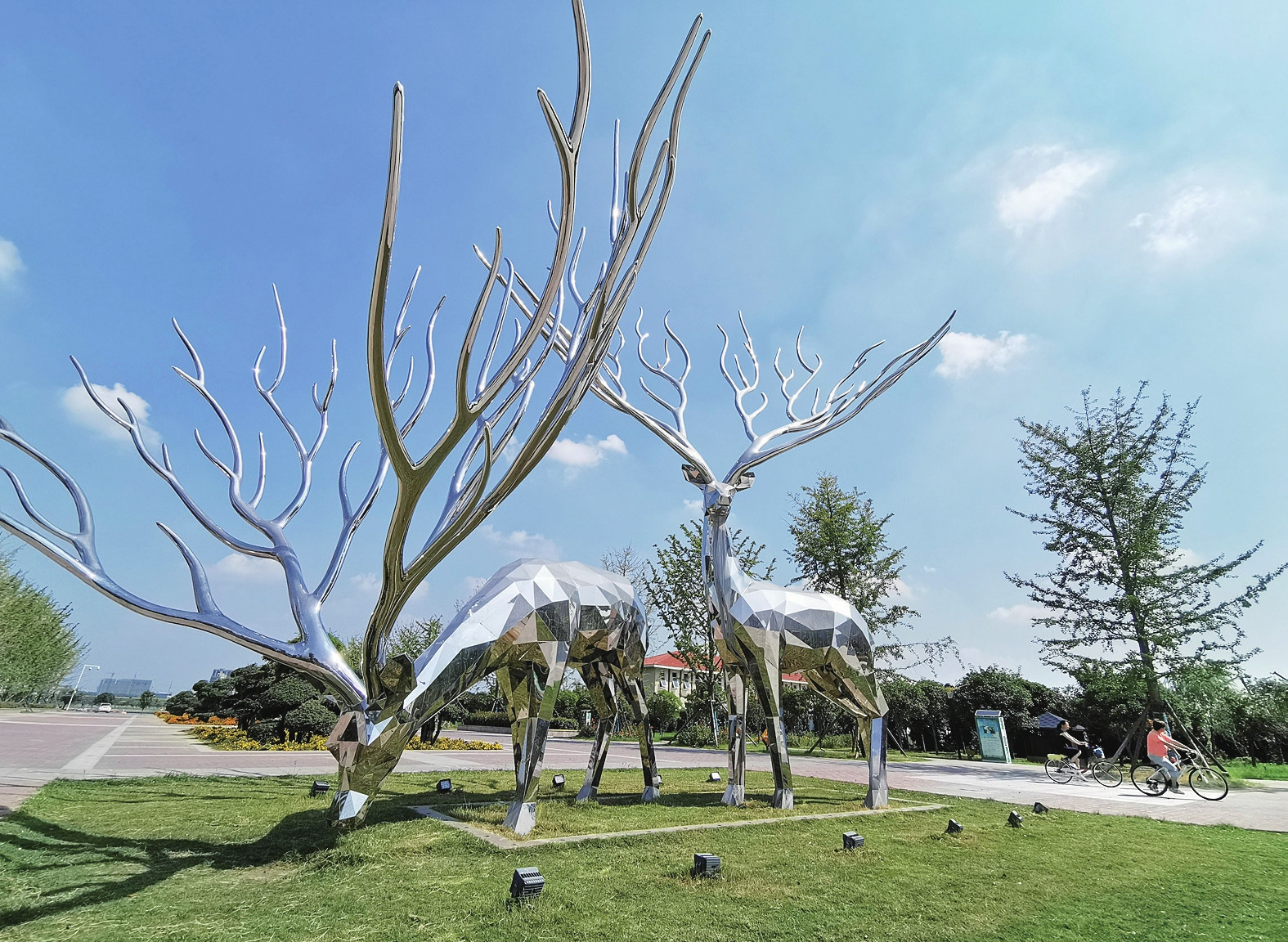 7月20日,市民在市區鹿鳴湖大型不銹鋼天鹿雕塑旁經過。城市雕塑被喻為“城市靈魂”和“讀城”亮點,不僅是城市文化與文明的重要標志,也是展現城市歷史文化、時代風貌和精神內涵的重要窗口。在全國文明城市創建中,我市建設了一批凸顯地域特色的經典性元素城市雕塑,城區街頭、廣場和游園等處的雕塑越來越多,不僅展現了城市的文化內涵,而且提升了城市品位。 本報記者 喬利峰 攝