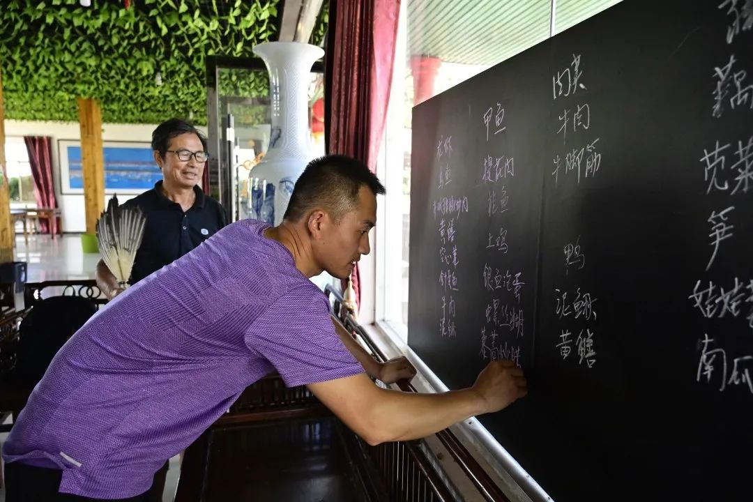 2020年 6月16日,在江西省余干縣田園鄱陽湖景區,上岸漁民朱義才(左)在自己開辦的農家樂內和兒子一起寫當日的菜譜。(新華社記者 彭昭之 攝)