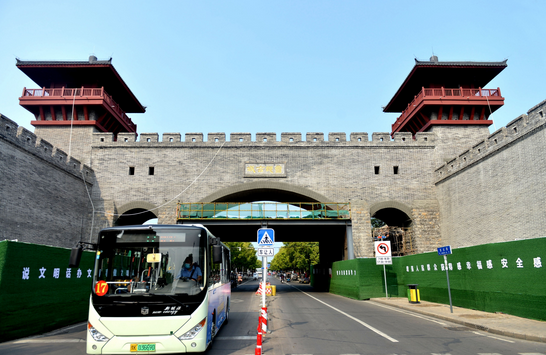 八月三十一日,一輛公交車從已拆除大部分施工圍擋的曹魏古城東城門處經過。曹魏古城東城門位于東大街東段,竣工后將形成市區獨特一景。記者 牛志勇 攝