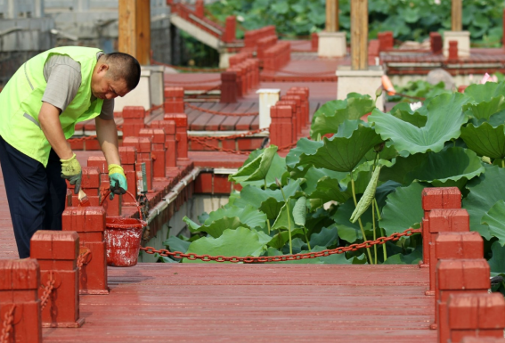 8月30日,許昌市市政實業有限公司護城河管理部門的工作人員對護城河一處廊道欄桿重新油漆。“看到護城河的欄桿涂上油亮的紅漆,感覺很醒目。”近日,不少細心的市民發現,護城河部分廊道的欄桿重新煥發出奪目的光彩。據悉,重新油上紅漆的欄桿光潔如新,并可保證在較長的時間內不出現腐朽。不少市民看到寫有“油漆未干,行人注意”字樣的告示,紛紛主動避讓,表示“看到光亮的欄桿心情更舒暢了”。 記者 牛書培 攝