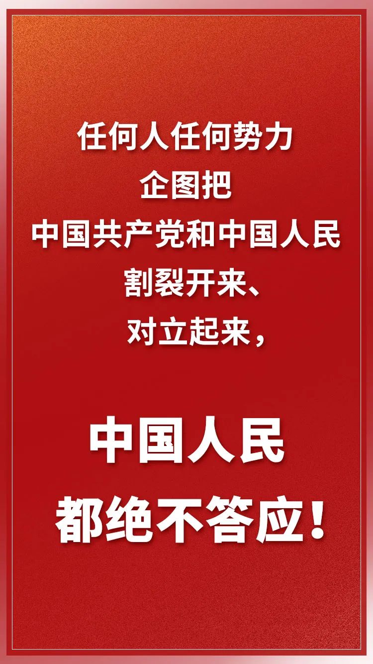 ——實現中華民族偉大復興,必須堅持以人民為中心。人民是歷史的創造者,是決定黨和國家前途命運的根本力量。中國共產黨來自人民、植根人民,初心和使命是為中國人民謀幸福、為中華民族謀復興,根本宗旨是全心全意為人民服務。我們要堅持一切為了人民、一切依靠人民,保持同人民的血肉聯系,緊緊依靠人民開拓事業新局面,促進全體人民共同富裕。任何人任何勢力企圖把中國共產黨和中國人民割裂開來、對立起來,中國人民都絕不答應!