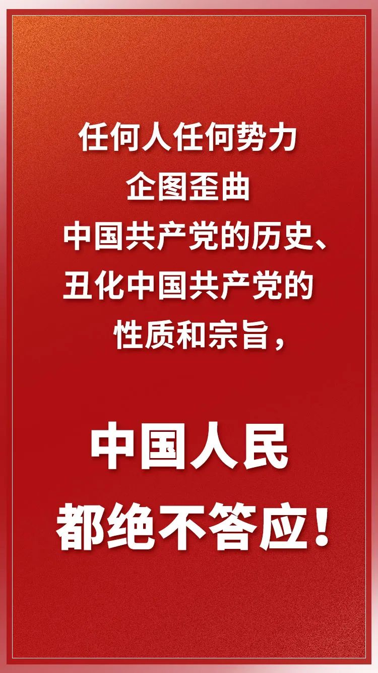 ——實現中華民族偉大復興,必須堅持中國共產黨領導。辦好中國的事情,關鍵在黨。只要我們深入了解中國近代以來的歷史就不難發現,鴉片戰爭以后的很長時間里,中國呈現各自為政、一盤散沙的亂象,這是日本軍國主義敢于發動全面侵華戰爭的重要原因。如果沒有中國共產黨領導,完成民族獨立和解放的任務就可能拖得更久、付出的代價更大,我們的國家更不可能取得今天這樣的發展成就、更不可能具有今天這樣的國際地位。堅持黨的全面領導,是國家和民族興旺發達的根本所在,是全國各族人民幸福安康的根本所在。我們要聚精會神抓好黨的建設,使我們黨越來越成熟、越來越純潔、越來越強大、越來越有戰斗力。全國各黨派、各團體、各民族、各階層、各界人士要緊密團結在黨中央周圍,萬眾一心向前進。任何人任何勢力企圖歪曲中國共產黨的歷史、丑化中國共產黨的性質和宗旨,中國人民都絕不答應!