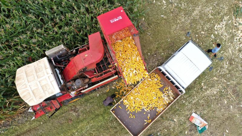 9月19日,在建安區陳曹鄉高標準糧田示范園區,村民在收獲玉米(無人機照片)。時下,我市迎來秋收季,玉米喜獲豐收,農民搶抓晴好天氣收獲玉米,力保顆粒歸倉,田間地頭一派繁忙景象。 記者 牛書培 攝
