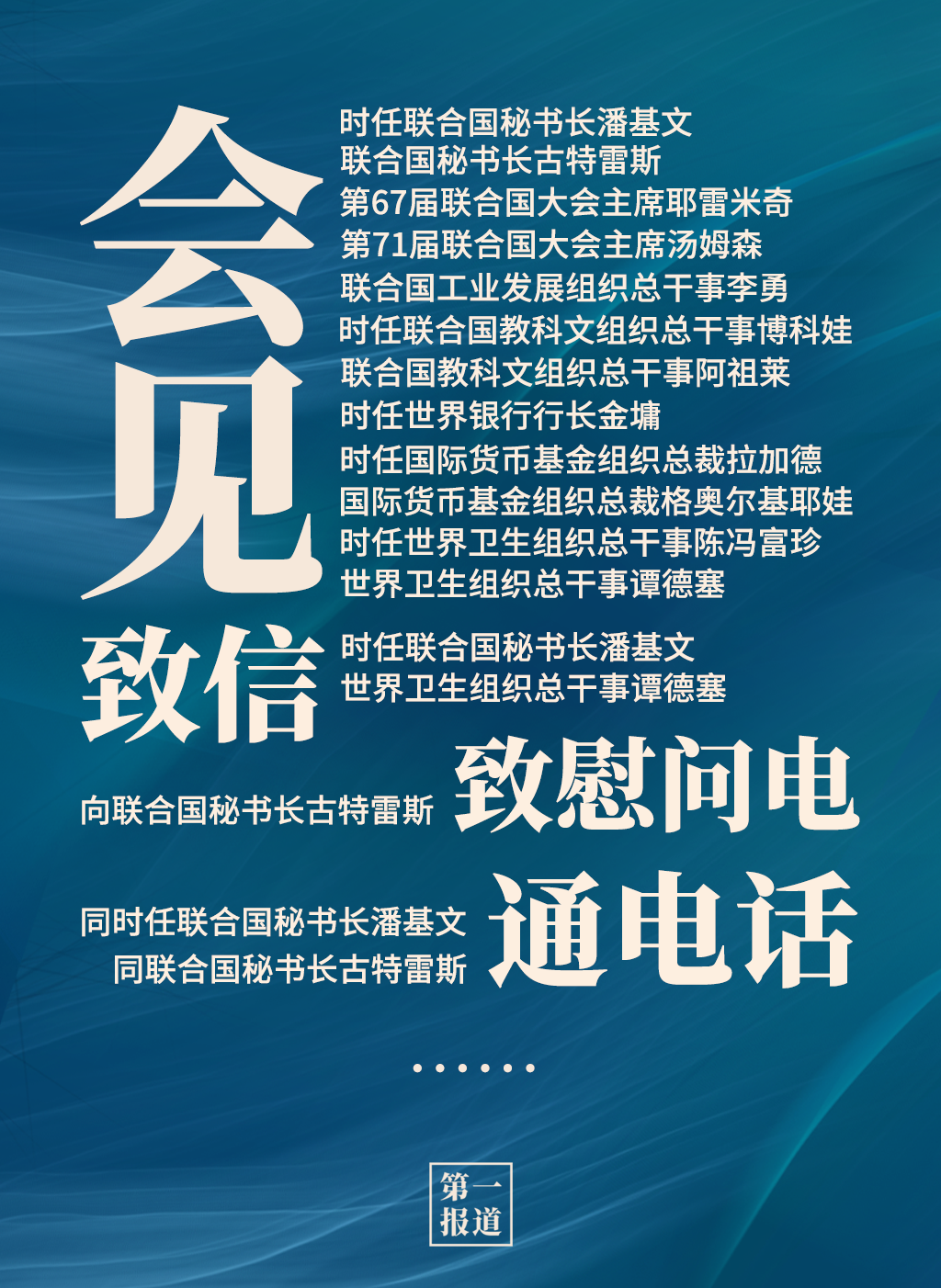 2013年以來,習(xí)主席通過會(huì)見、通話、致信函等多種方式同聯(lián)合國(guó)主要官員保持密切溝通。互動(dòng)對(duì)象包括聯(lián)合國(guó)秘書長(zhǎng)、聯(lián)合國(guó)大會(huì)主席,還有聯(lián)合國(guó)工業(yè)發(fā)展組織、聯(lián)合國(guó)教科文組織、世界銀行、國(guó)際貨幣基金組織、世界衛(wèi)生組織等聯(lián)合國(guó)專門機(jī)構(gòu)主要負(fù)責(zé)人。
