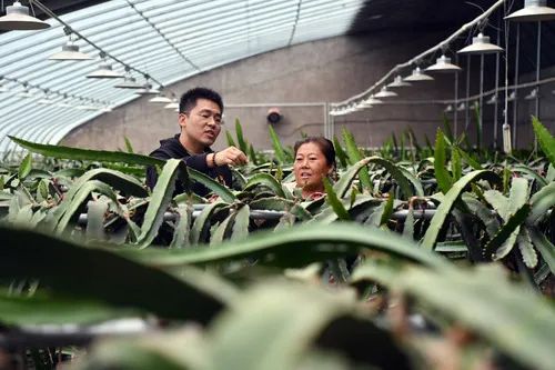 田昕(左)在馬橫嶺村的大棚內(nèi)與承包戶田利華交流火龍果種植經(jīng)驗(yàn)(10月12日攝)。本報記者李嘉南攝