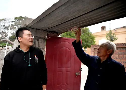 牛橫嶺村村民牛天保(右)將自家門框內(nèi)的橫梁掰成拱形并用布條包住,以防田昕進(jìn)門時碰到頭(10月12日攝)。本報記者李嘉南攝
