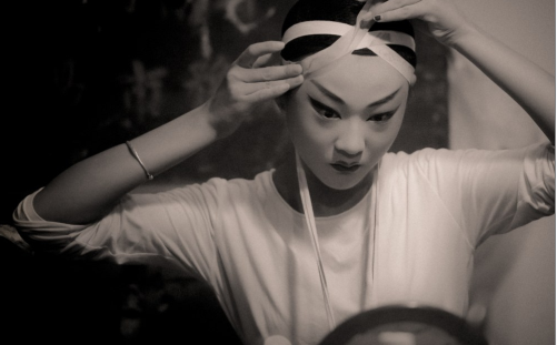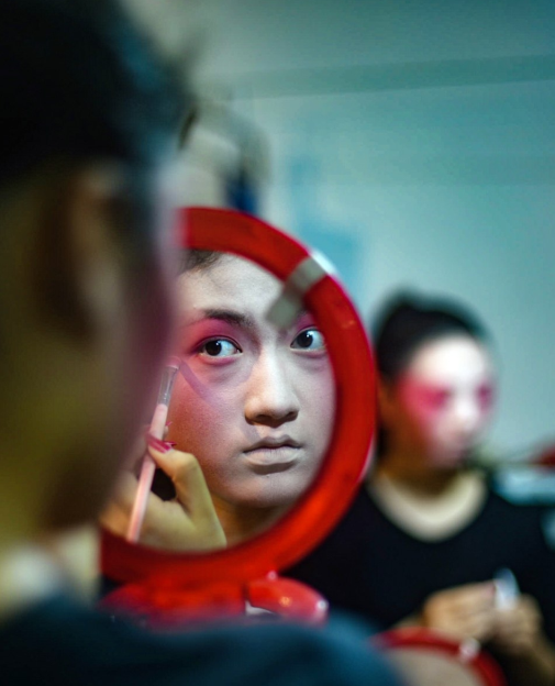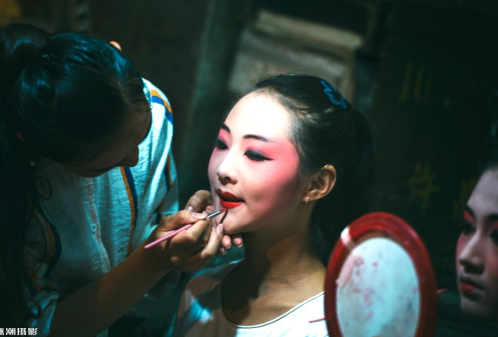 準備上戲臺的孩子們在后臺認真梳妝,這一幕也成為一道迷人的風景線。