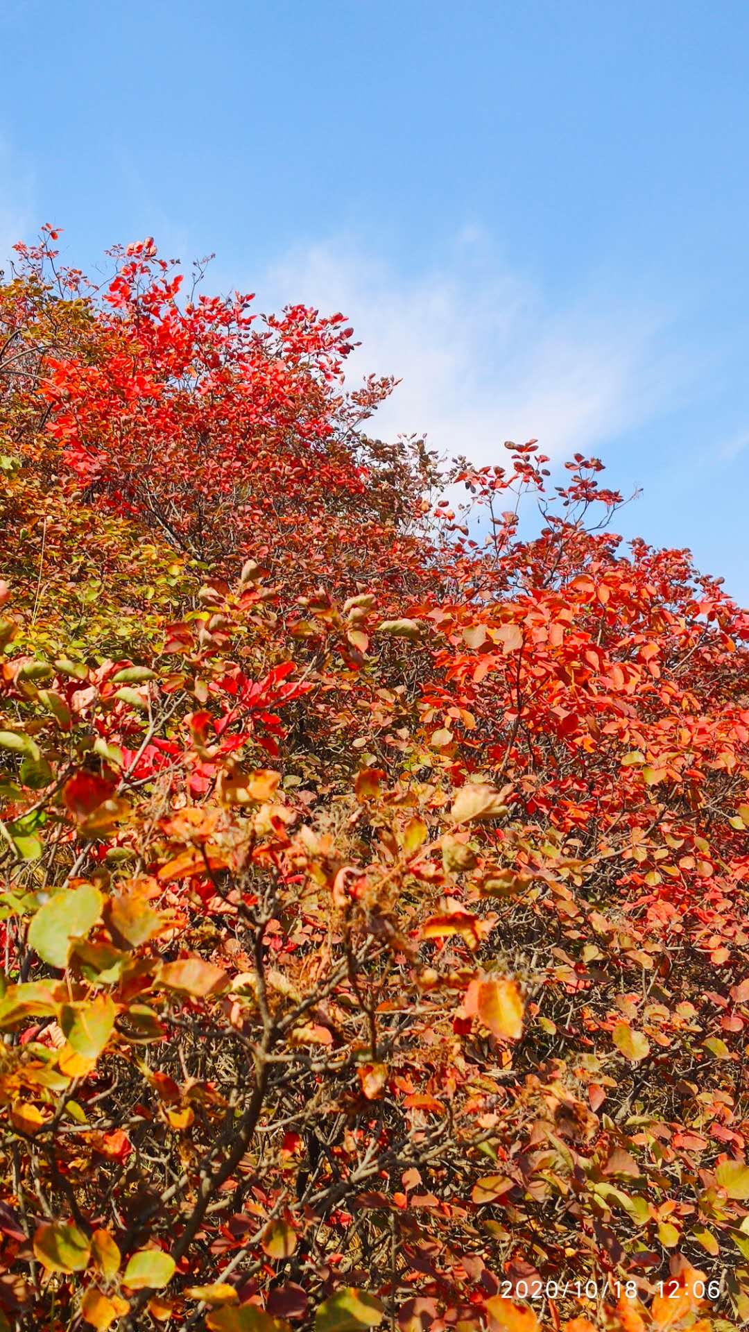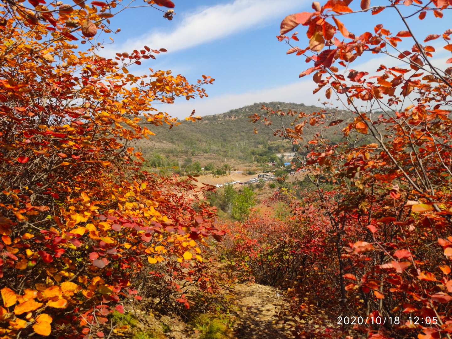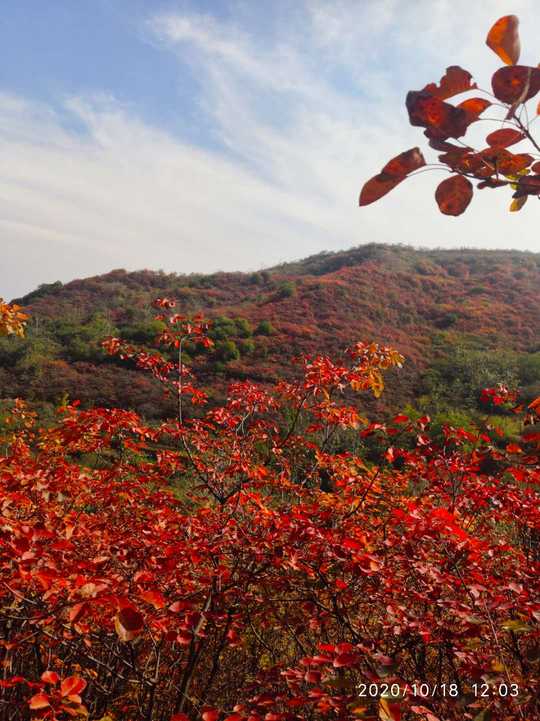 10月18日,驅車前往,站在該村分水嶺山頂極目四望,滿目紅葉盡收眼底。經數日細雨沐浴的紅葉在藍天白云的映襯下分外妖嬈。深吸一口雨后山間帶著泥土芳香而又清新的空氣,那一縷清香沁人心脾。