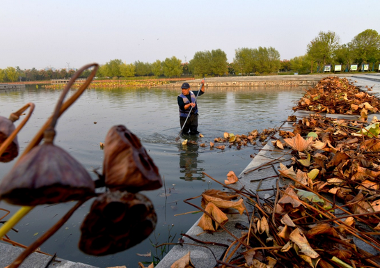 10月26日,市區中央公園,一名工人正在收割殘荷。目前,市區中央公園的荷花大都已經凋零,荷葉也進入枯萎期。為給市民提供優美、舒心的環境,近日,中央公園管理部門及時組織人員對部分區域的殘荷進行集中清理。 記者 牛志勇 攝