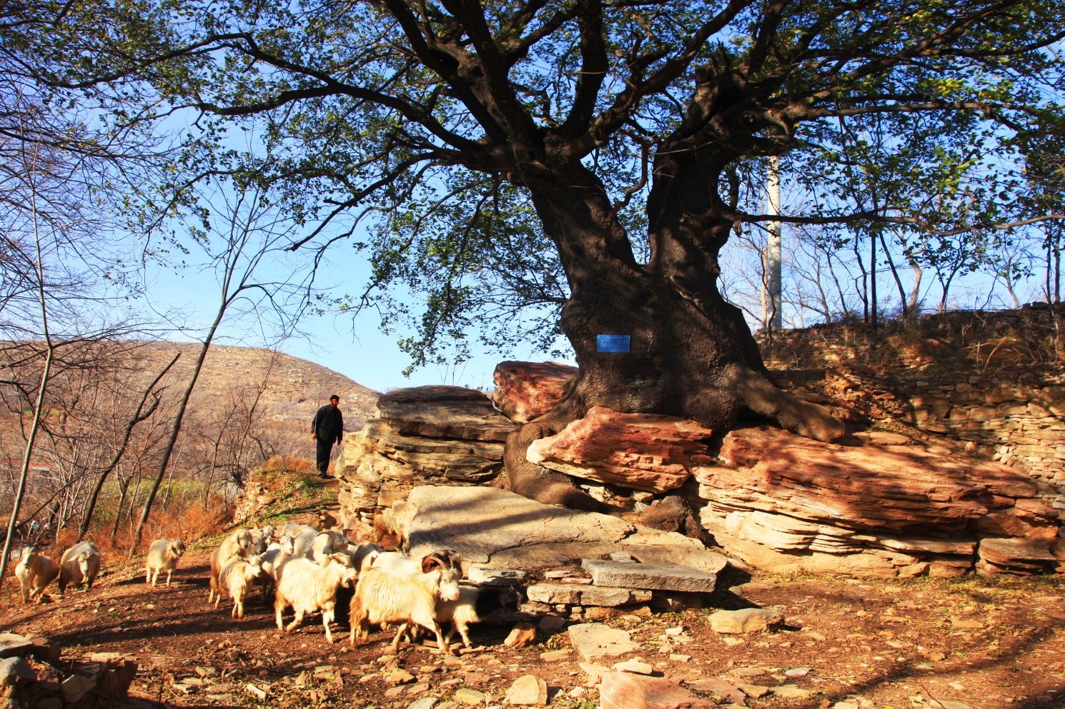 羊群在農人的驅趕下走過大樹。陽光透過枝葉的縫隙,在它們身上留下斑駁的光影。黃色的土地、金色的陽光,好溫暖的感覺。