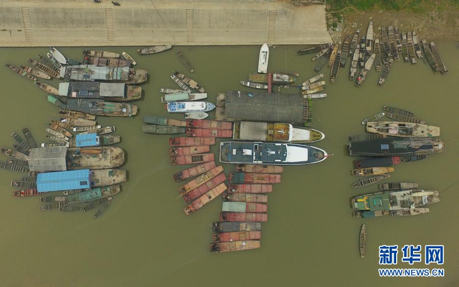 在湖南常德漢壽縣蔣家嘴鎮(zhèn),待回收的鐵漁船停靠在洞庭湖邊(2019年12月17日攝,無人機(jī)照片)。2020年1月1日零時(shí)起,長江流域332個(gè)自然保護(hù)區(qū)和水產(chǎn)種質(zhì)資源保護(hù)區(qū)全面禁止生產(chǎn)性捕撈。新華社記者 薛宇舸 攝