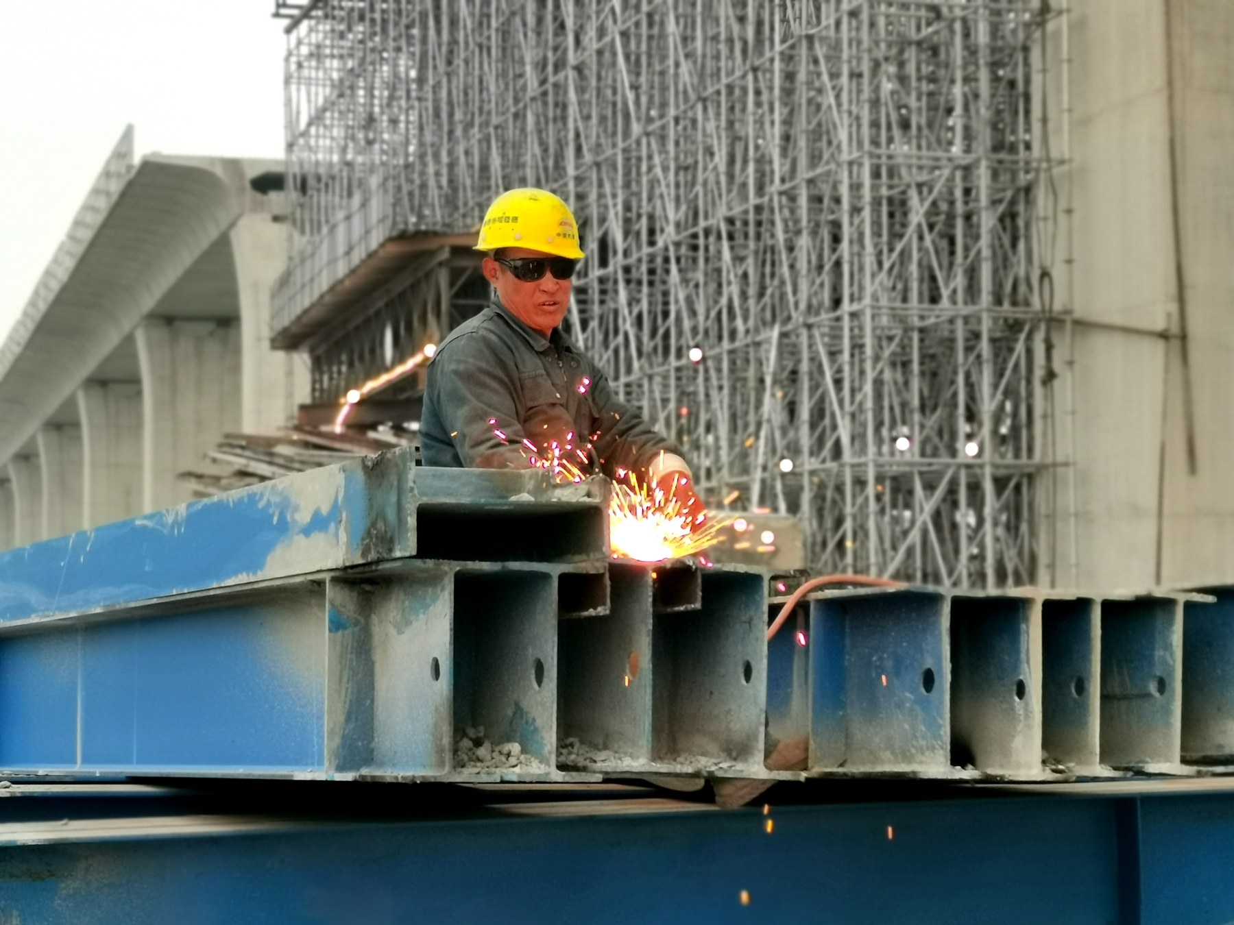 該連續(xù)梁上,藍(lán)色的施工架子還未拆除,工人在各個(gè)角落忙碌;連續(xù)梁下,各種車輛在京港澳高速公路上飛馳。劉京緯介紹,這座連續(xù)梁的橋面寬度為10.6米,橋下至高速公路的凈空為7.5米。工程人員采用掛籃施工法,把長(zhǎng)120米的主跨分為14個(gè)號(hào)塊,由兩端向中間施工。