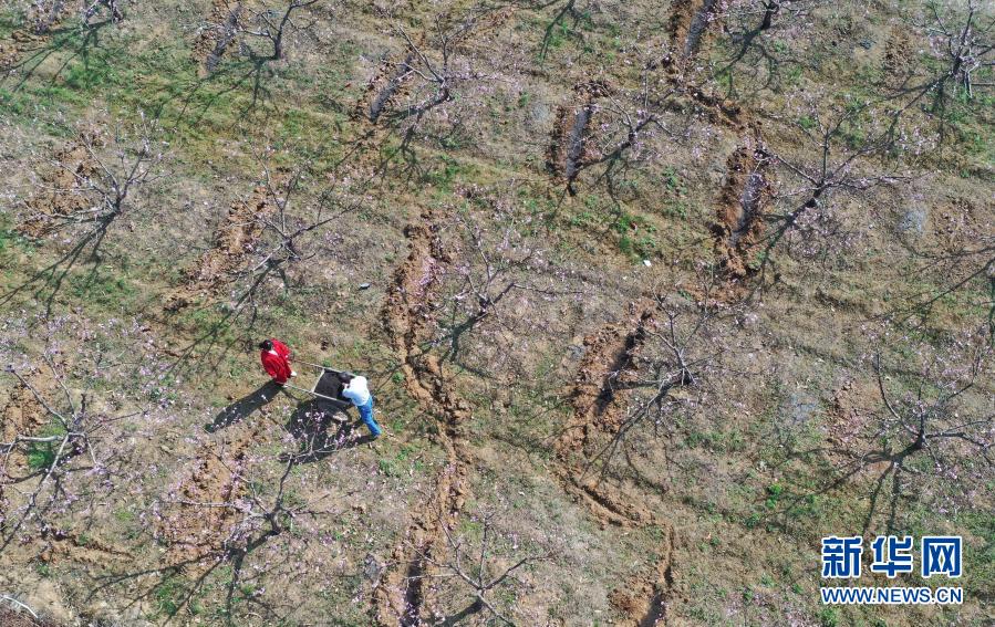 2月15日,在湖南省永州市道縣大坪鋪農(nóng)場,果農(nóng)在給桃樹追肥(無人機照片)。新華社發(fā)(蔣克青 攝)