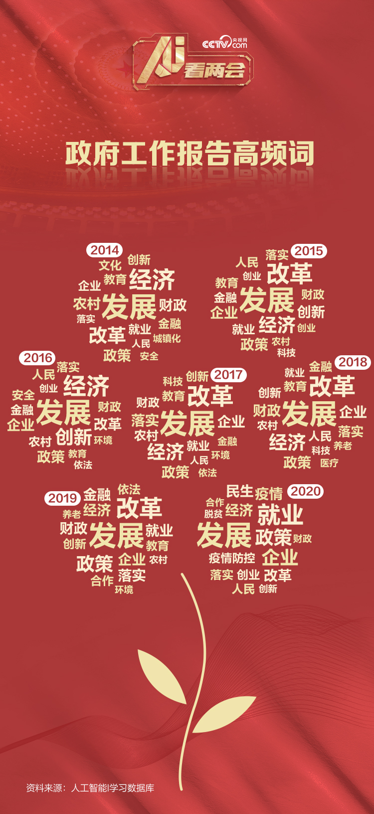 依托人工智能I學(xué)習(xí)數(shù)據(jù)庫(kù),央視網(wǎng)人工智能編輯部還分析了2014年以來(lái)每一份政府工作報(bào)告的高頻詞。