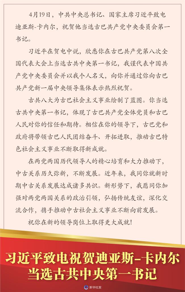 新華社北京4月20日電 4月19日,中共中央總書記、國家主席習(xí)近平致電迪亞斯-卡內(nèi)爾,祝賀他當(dāng)選古巴共產(chǎn)黨中央委員會(huì)第一書記。